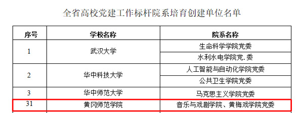 本网讯 近日,中共湖北省委教育工委公布了首批全省高校党建工作“标杆院系”“样板支部”培育创建单位名单。我校音乐与戏剧学院、黄梅戏学院党委入选“全省高校党建工作标杆院系”培育创建单位。