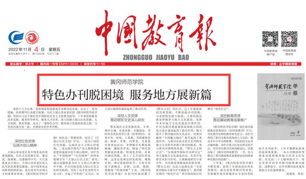 11月4日,《中国教育报》以《特色办刊脱困境 服务地方展新篇》为题,从“深挖红色资源 弘扬大别山精神”“深挖人文资源 推动鄂东文史深入研究”“深挖教育资源 推动基础教育成果推广”三个方面报道了我校办在大别山革命老区的《黄冈师范学院学报》坚持以习近平新时代中国特色社会主义思想为指导,十年来坚持服务改革发展、服务科学研究、服务人才培养,深入挖掘大别山红色资源、人文资源、教育资源,走出了一条特色办刊、服务地方发展的奋进之路,力争创办成全省一流、全国知名的学术刊物。
