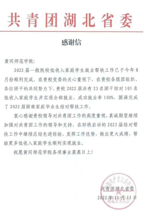 本网讯 近日,我校收到共青团湖北省委的一封感谢信。这封信主要肯定了我校23名团干部历经近一年时间结对帮扶我校105名贫困毕业生成功就业、高标准完成2022届家庭困难毕业生的结对帮扶工作,同时希望我校继续做好2023届毕业生的就业帮扶工作。