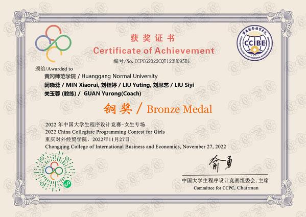 本网讯 11月27日,2022第八届中国大学生程序设计竞赛(ACM/CCPC)女生赛落下帷幕,我校计算机学院ACM实验室成员闵晓蕊、刘钰婷、刘思艺组成的“希望每一发都能返回AC”参赛女生团队经历5个小时的激烈角逐,在ACM实验室总教练关玉蓉老师的指导下,勇夺铜牌,取得历史性突破!