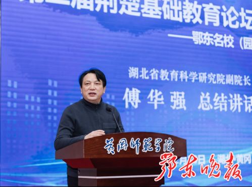 湖北省教育科学研究院副院长傅华强总结讲话,做总结讲话。他说,黄冈师范学院近年来事业发展迅猛,在人才培养、科学研究、社会服务和文化传承等方面取得了长足的进步和快速的发展。特别是教育学科和教育学院的发展彰显了一所百年师范学院的坚守和担当!本次论坛一是政策引领性强,学术含金量高,各位专家学者发表真知灼见,旁征博引,是一场宏大学术盛宴;二是实践指导性强,各位中小学校长和专家们在线下或云端聚会,共话基础教育治理和学校创新管理之道,对于推进中国式教育现代化,办好人民满意的教育具有很强的参考价值。总体来说,本次学术年会内容丰富、交流充分、质量很高,达到了预期效果。