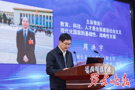 上午主论坛由学校党委副书记陈朝阳主持。5位专家学者、名校长和名师做报告。湖北省人大常委会副主任、华中师范大学周洪宇教授做了题为《教育、科技、人才是全面建设社会主义现代化国家的基础性、战略性支撑》的报告,为我们呈现了一场高瞻远瞩、视野宏大的学术报告,具有重要的理论指导意义。