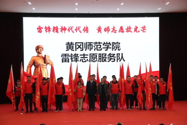 漆昌柱宣布“雷锋精神代代传 黄师志愿放光芒”黄冈师范学院志愿服务活动暨大学生社区实践计划正式启动。张章为各教学学院授予“雷锋志愿者服务队”队旗。