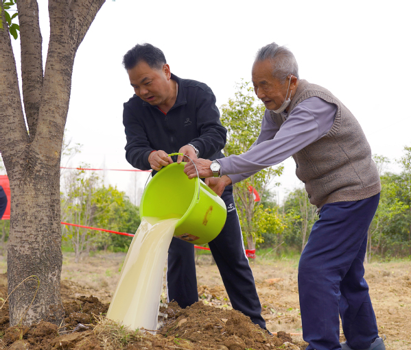 此次所植桂花树全部为林桂生教授捐赠。活动伊始,林教授进行了发言。林教授为我校1997年从物电学院退休的老教授,今年已有88岁高龄。陈向军代表学校向林教授表示由衷感谢。校领导与师生代表一起挥锄铲土、扶苗培土、拎桶浇水,大家分工协作、相互配合,共同种下树苗,现场一派热火朝天的景象。
