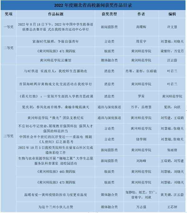 其中,《2022年8月18日下午,2022年中国中学生跆拳道联赛总决赛开幕式在黄冈师范学院体育运动中心举行》获新闻摄影类一等奖;《黄冈师院报》471期四版获版面类二等奖,《紧握时代脉搏,争做自强青年》获得言论类二等奖,《黄冈师范学院云廉馆》获媒体融合类二等奖;《2022年10月5日黄冈师范学院美院师生在晏家山社区完成墙体彩绘工作》、《生物与农业资源学院开展“翱翔之翼”大学生志愿服务队科普课堂进校园活动》获新闻摄影类三等奖,《黄冈师院报》465期四版、473期四版获版面类三等奖、《与时俱进 实践育人:黄冈师范学院师生直播助农》、《首届海峡两岸黄梅戏文化交流活动在黄冈师范学院举行》、《<霜天红烛>:一堂别开生面的入学教育思政课》获消息类三等奖;《夏庆利:春风化雨育桃李,桑榆非晚霞满天》、《黄冈师范学院“微光”团队支教纪实》获通讯与深度报道类三等奖;《不忘初心牢记使命,展现教育强国科技强国人才强国的师范担当》、《中国社会半个世纪的沉浮变迁——重温电视剧<人世间>后之新思考》获言论类三等奖;《温暖有爱—黄师疫情防控有力度更有温度》、《为这个兰州小伙儿点赞》获媒体融合类三等奖。