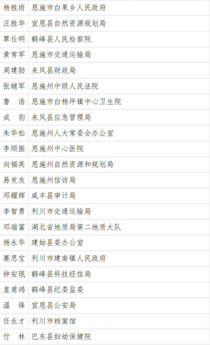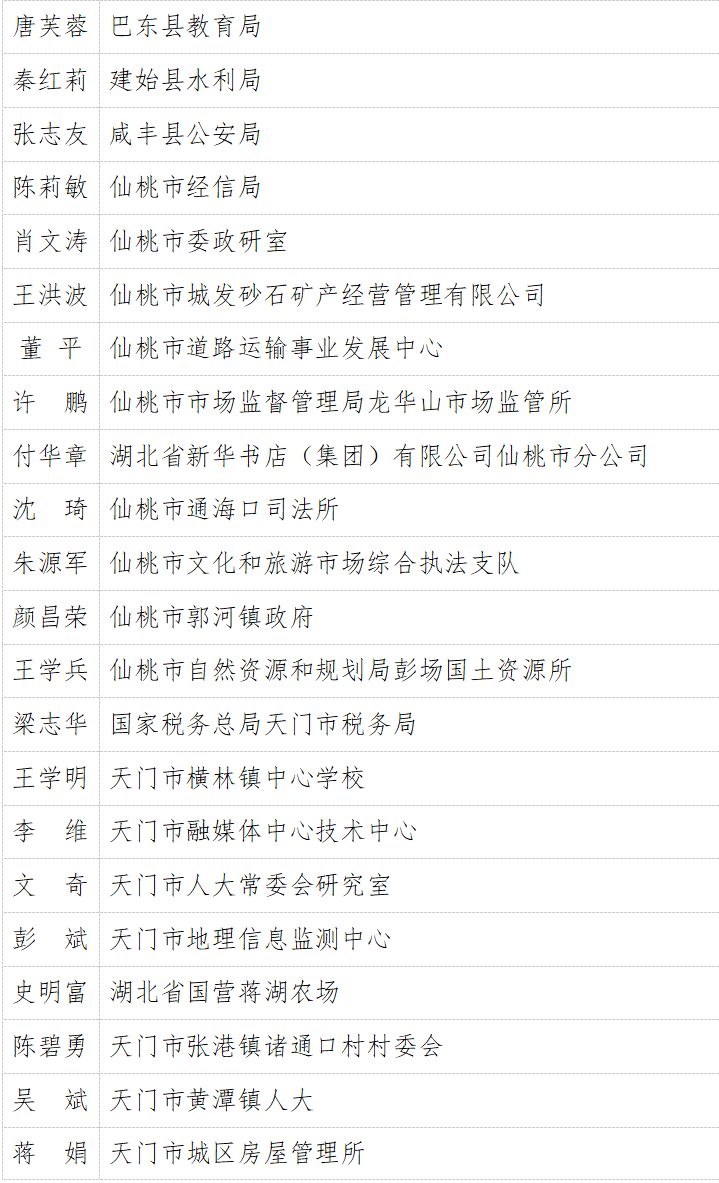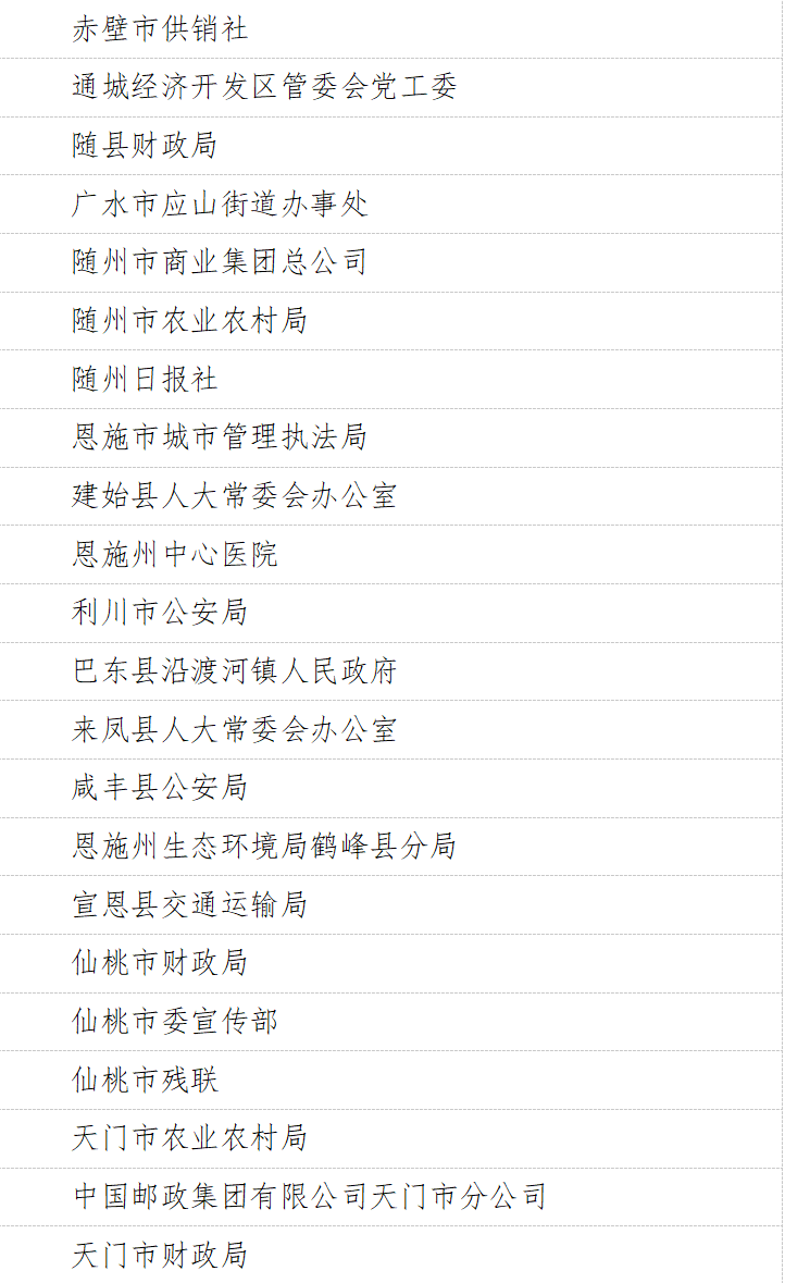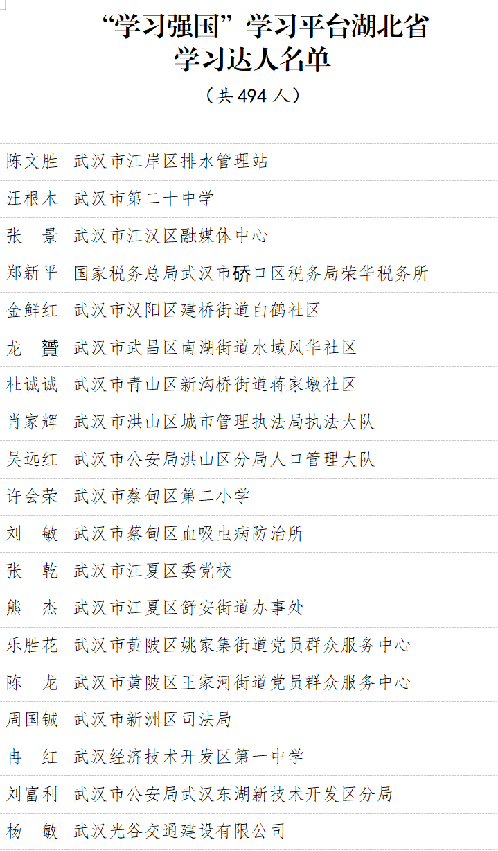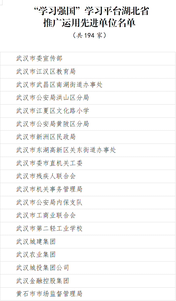 “学习强国”湖北学习平台为选树典型、学习先进,进一步激发广大干部群众学习热情,推动“学习强国”学习平台在全省推广使用,拟内部推选宣传一批全省“学习强国”学习平台推广运用先进单位、学习达人。经全省各级“学习强国”学习平台学习组织架构积极推选,市州党委宣传部和省委直属机关工委、省委教育工委、省政府国资委严格审核把关,共推选出推广运用先进单位194家,学习达人494名。现将拟推选宣传名单向社会公示。