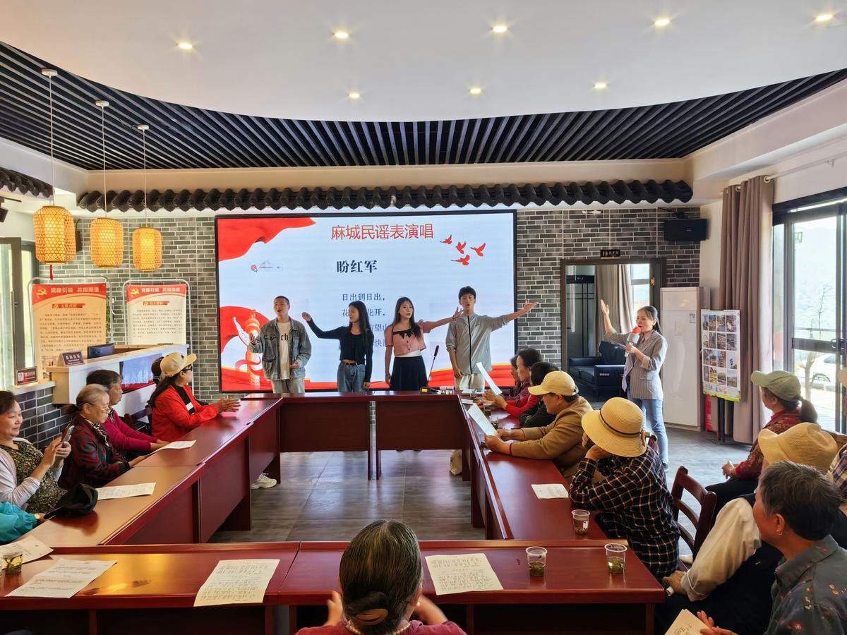 上午10时许,小分队在村部综合楼大厅为四十多位村民教唱了麻城革命历史民谣《送别》和《盼红军》,同时集体演唱了麻城革命历史民歌《苏区好风光》和《红军游击歌》。