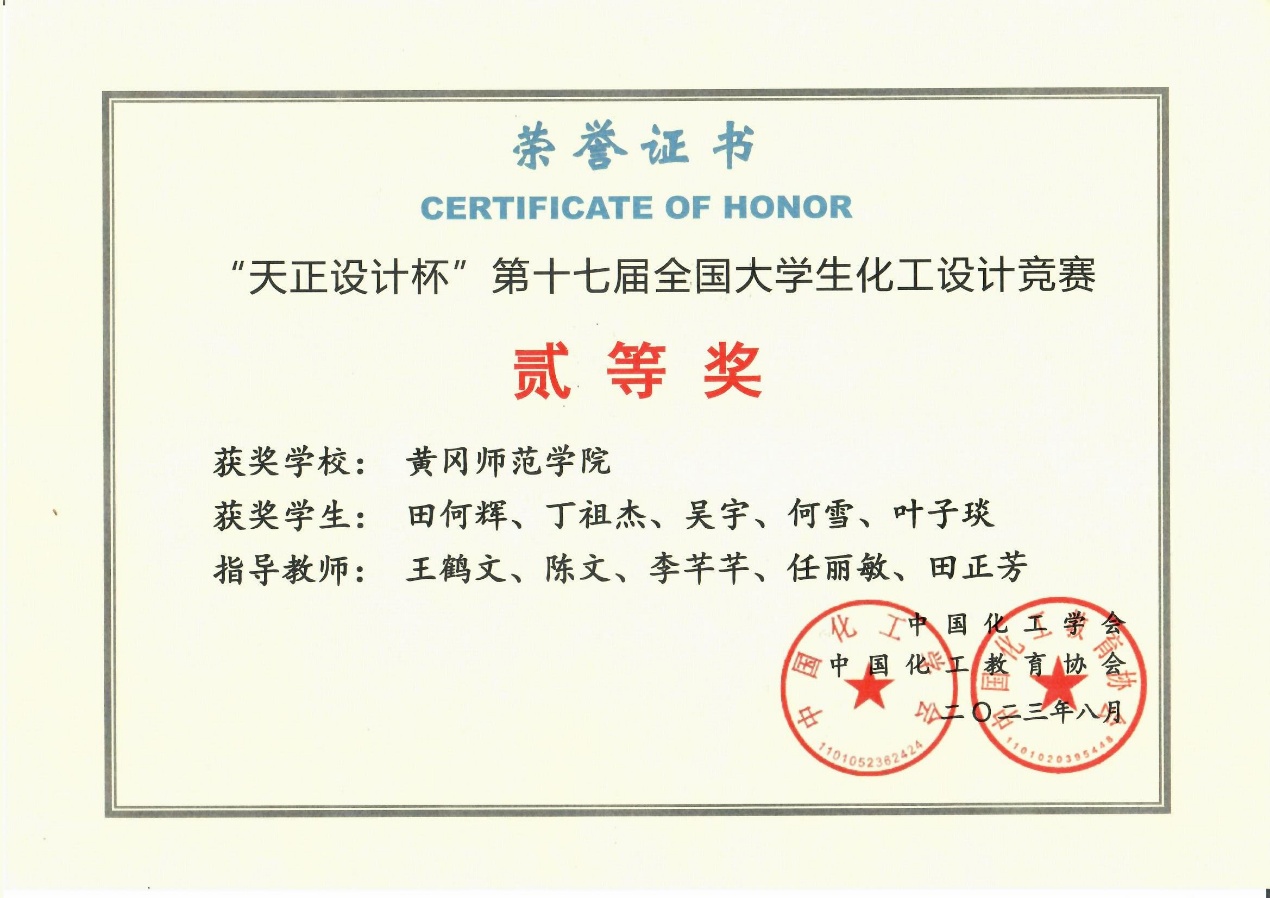 本网讯 近日,由中国化工学会、中国化工教育协会主办,中国石油大学(北京)协办的“天正设计杯”第十七届全国大学生化工设计竞赛在北京落下帷幕。由我校化学化工学院王鹤文、陈文、李芊芊、任丽敏等5名老师指导,化学工程与工艺专业2020级学生田何辉(队长)、丁祖杰、吴宇、何雪、叶子琰组成的“花海队”在华中赛区中表现优异,成功入围决赛,并荣获全国二等奖。