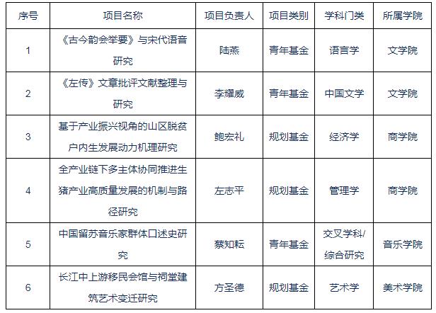 本次获批立项项目中,规划基金项目有3项,青年项目有3项。在学科分布方面,经济学1项,管理学1项,语言学1项,中国文学1项,艺术学1项,交叉学科/综合研究1项。