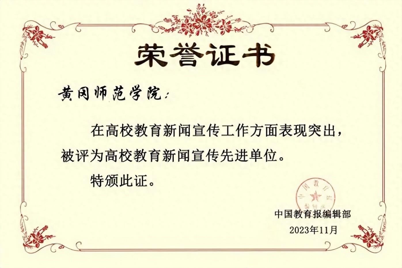 11月23日,2023年湖北教育系统舆论引导培训暨中国教育报刊社湖北通联会议在武汉举行,会上对先进单位和先进个人进行了表彰。黄冈师范学院在2023年教育新闻宣传工作方面表现突出,被授予“高校教育新闻宣传先进单位”荣誉称号,余艳军同志获评“高校优秀通讯员”。