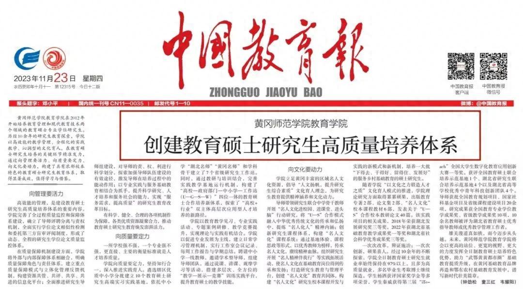 近日,《中国教育报》以《创建教育硕士研究生高质量培养体系》为题,从“向管理要活力”“向质量要定力”“向文化要动力”三个方面报道了黄冈师范学院教育学院在教育硕士研究生培养的关键环节精准发力,构建了具有浓郁校本特色的教育硕士研究生教育体系,取得显著成效。