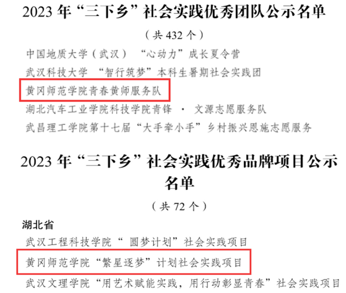 近日,2023年全国大中专学生志愿者暑期文化科技卫生“三下乡”社会实践活动通报结果揭晓,经基层申报、省级团委审核推荐、组织评议等环节,团中央青年发展部决定对表现突出的352个单位、432个团队、283名个人、71个项目给予通报表彰。黄冈师范学院校团委青春黄师服务队获评2023年“三下乡”社会实践优秀团队。黄冈师范学院教育学院(一多书院)“繁星逐梦”计划社会实践项目获评2023年“三下乡”社会实践优秀品牌项目。