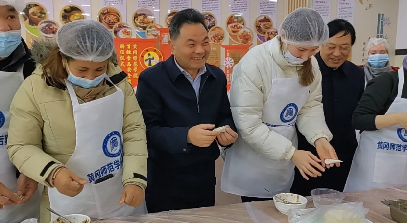 下午,黄冈师范学院党委书记陈向军及相关校领导一行来到活动现场,纷纷挽起袖子,投入包饺子大军中。不一会儿,形态不一、手法各异的饺子就摆满了托盘。