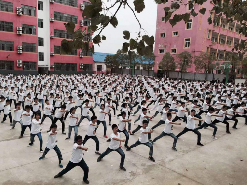 调研组们风尘仆仆,迎着寒风,一下车就直奔学校运动场,观看学生集体岳家拳表演。运动场上,八百多学生身穿校服,动作整齐划一,出拳刚健有力,场面气势宏伟,似千军万马奔腾,令人振撼!
