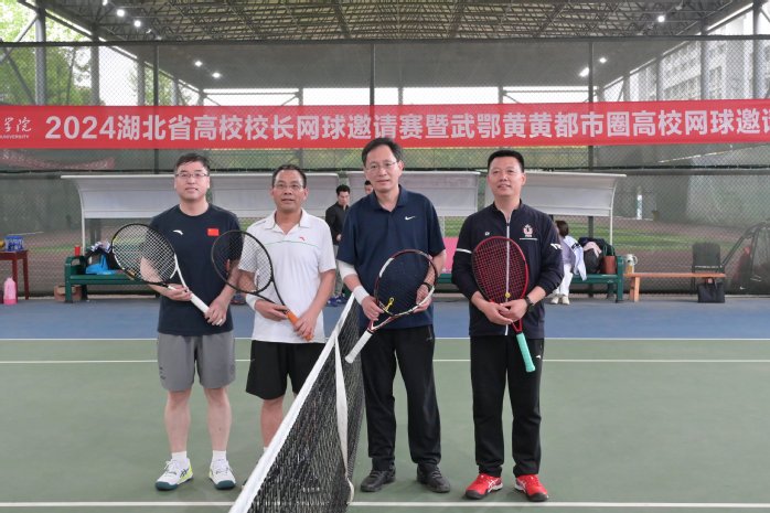 本网讯 4月13日,2024武鄂黄黄都市圈高校网球邀请赛在我校明珠体育馆举行。校党委书记陈向军,党委副书记、校长漆昌柱,中国学生体育联合会大学网球分会主席安春元等出席活动。开幕式由党委常委、副校长宋文生主持,漆昌柱致欢迎词。