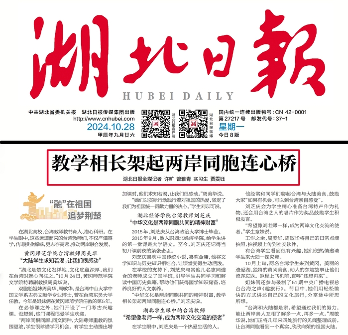 《湖北日报》2024年10月28日第2版(要闻)以《教学相长架起两岸同胞连心桥》为题,报道我校台湾籍教师周美华、周敏华双胞胎姐妹教书育人、潜心科研,通过网络平台分享文旅见闻,积极传扬中国传统文化故事,推动两岸文化交流。