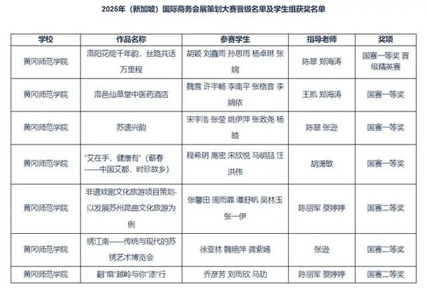 11月9日,由中国国际贸易促进委员会商业行业委员会、中国国际商会商业行业商会和中国商业经济学会联合主办的2025年(新加坡)国际商务会展策划大赛中国地区选拔赛暨第十八届全国高校商业精英挑战赛文旅与会展创新创业实践竞赛全国总决赛圆满落幕。黄冈师范学院地理与旅游学院选派7支队伍参赛,共斩获4项一等奖和3项二等奖,学校荣获最佳院校组织奖。
