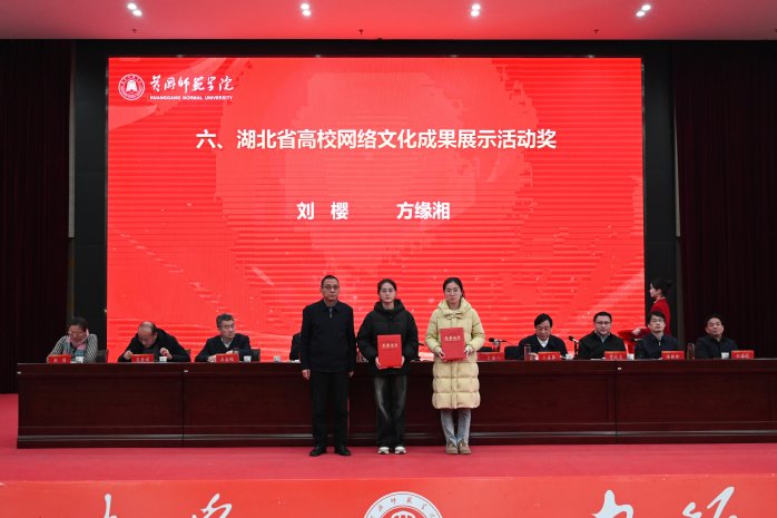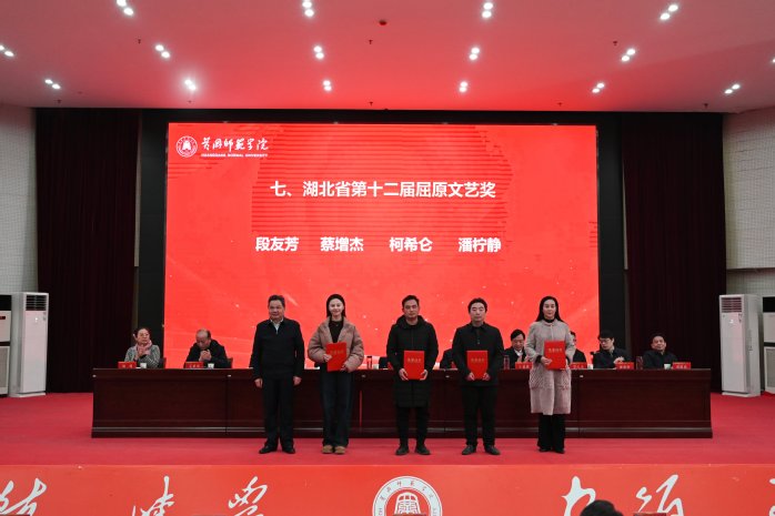 全体校领导为湖北省第十二届屈原文艺奖、湖北省高校网络文化成果展示活动奖、宣传思想文化工作先进集体及先进个人等获奖单位和个人颁奖。