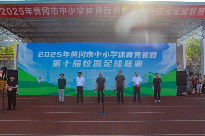 本网讯 7月4日上午,2025年黄冈市中小学体育竞赛暨第十届校园足球联赛在我校北区足球场盛大开幕。校党委常委、副校长夏庆利,湖北省教育厅体卫艺处处长丁雪峰,黄冈市政府副秘书长何峰华,黄冈市教育局党组书记、局长洪程,黄冈市体育事业发展中心主任余觅等出席仪式。全市中小学49个代表队56支球队1116名运动员和教练员参加仪式。