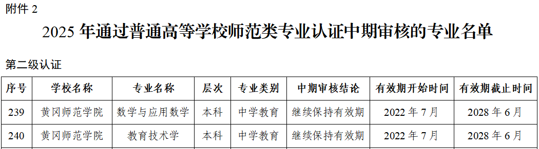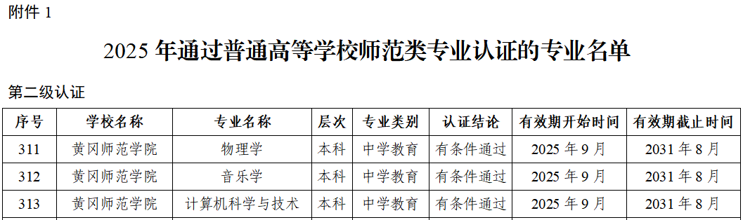 本网讯 近日,教育部办公厅公布了2025年通过普通高等学校师范类专业认证的专业名单及中期审核专业名单(教师厅函〔2025〕18号),我校物理学、音乐学、计算机科学与技术3个专业通过第二级专业认证,认证结论有效期六年,自2025年9月起至2031年8月止;教育技术学和数学与应用数学2个专业通过了师范类专业认证中期审核,继续保持原认证有效期。