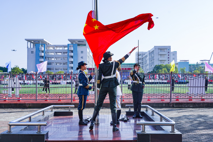 国旗护卫队迈着铿锵有力的步伐,高举五星红旗率先入场,鲜红的旗帜在朝阳下迎风飘扬。裁判员代表队、各学院方队气势昂扬、神采奕奕,踏着整齐划一的步伐走过主席台接受检阅。