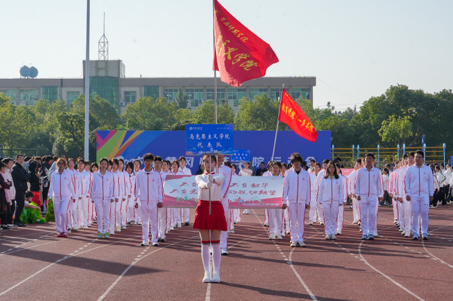 国旗护卫队迈着铿锵有力的步伐,高举五星红旗率先入场,鲜红的旗帜在朝阳下迎风飘扬。裁判员代表队、各学院方队气势昂扬、神采奕奕,踏着整齐划一的步伐走过主席台接受检阅。