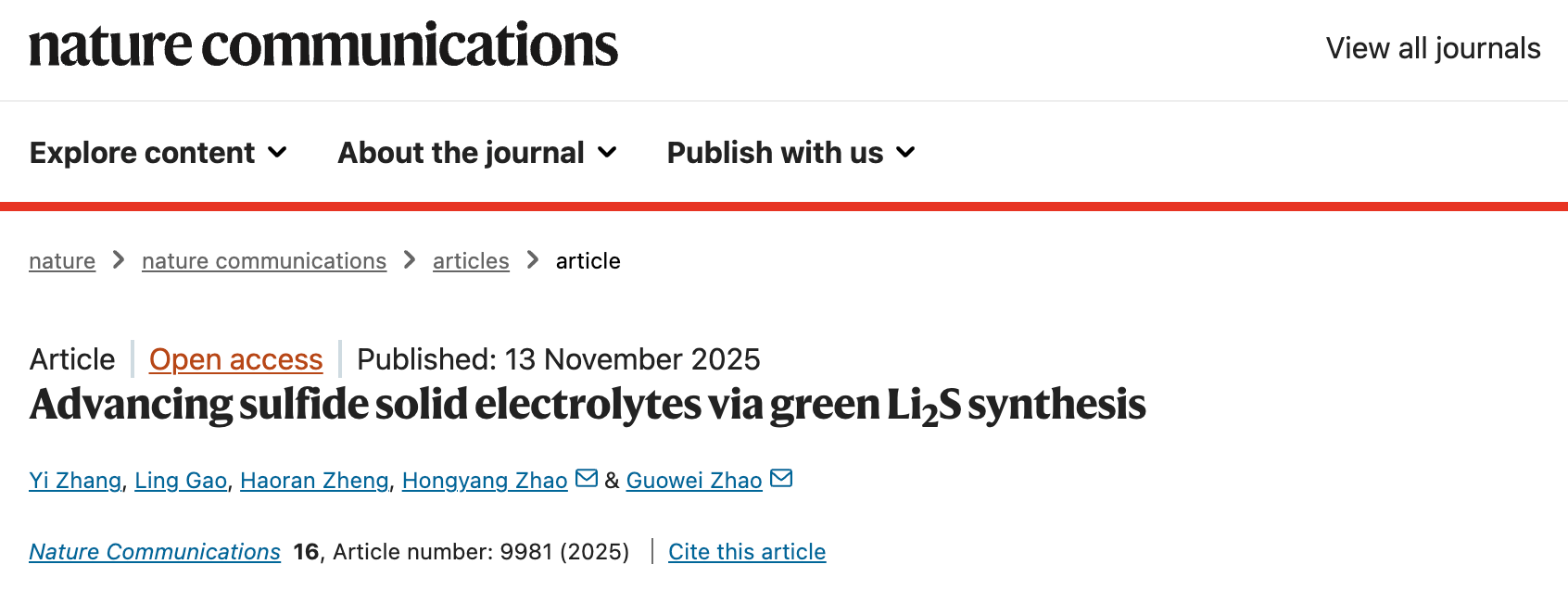 11月13日,黄冈师范学院化学化工学院赵国伟教授研究团队以学校为第一单位在《Nature》子刊《Nature Communications》 (《自然·通讯》)发表题为“Advancing sulfide solid electrolytes via green Li2S synthesis”的研究论文,标志着黄冈师范学院在全固态电池固体电解质关键材料领域取得重要研究进展。
