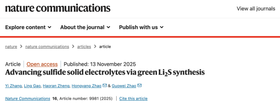 11月13日,黄冈师范学院化学化工学院赵国伟研究团队在全固态电池固体电解质关键材料领域取得重要研究进展,相关研究论文《Advancing sulfide solid electrolytes via green Li2S synthesis》在Nature子刊《自然·通讯》(Nature Communications)上发表。