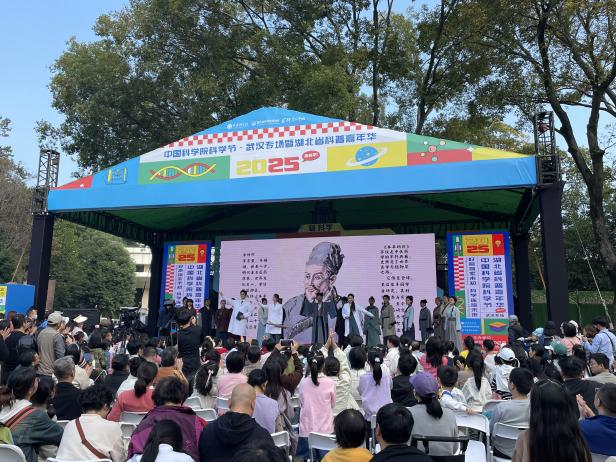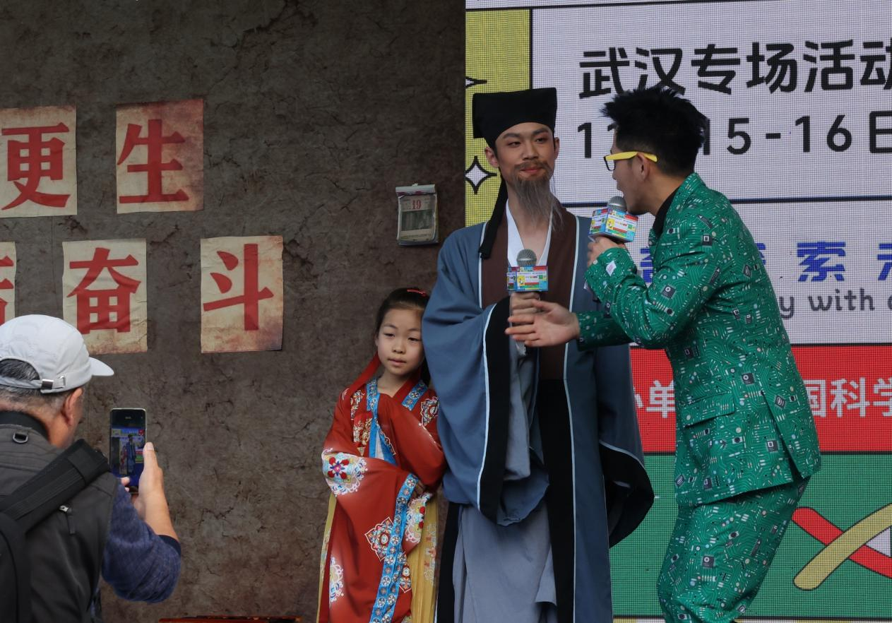 “哇!太帅了!”11月15日,当来自俄罗斯的黄冈师范学院留学生叶国在舞台上一个空翻时,台下的观众发出一片惊呼,这是发生在中国科学院第八届科学节・武汉专场暨2025年湖北省科普嘉年华中的一幕。当天,应举办者邀请,该校传媒与影视学院的两部原创话剧《本草长歌》与《地脉寻踪》相继上演,生动演绎了李时珍与李四光这两位黄冈籍科学先贤探求真理、百折不挠的科学故事。