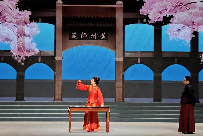 本网讯 11月14日晚,我校原创大型黄梅戏音乐剧《霜天红烛》在红安县影剧院成功展演。浙江省发改委党组成员、副主任骆方豪,宁波市发改委党组成员、二级巡视员吴军,黄冈市发改委党组书记、主任蔡伟,校党委副书记王基家,红安县委书记胡广,红安县委副书记、代县长钟林等观摩演出。