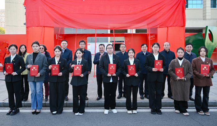 全体校领导为20名成果展解说员代表颁发聘书,共同为成果展揭幕,并参观了成果展区。