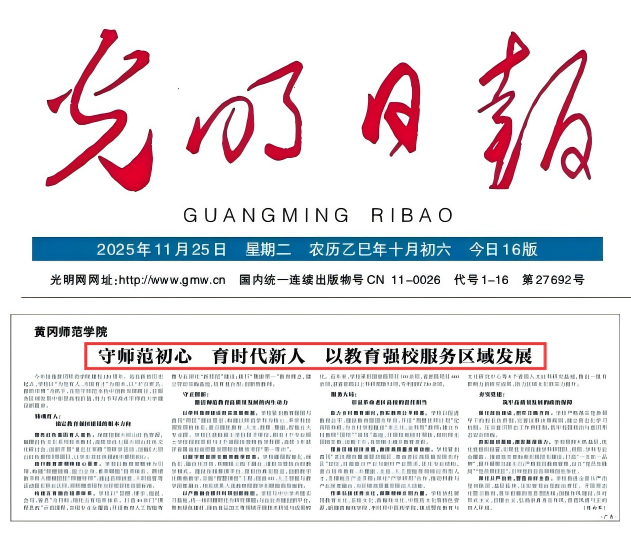 《光明日报》2025 年11月25日第4版(综合新闻)刊发了我校党委书记陈向军署名文章《黄冈师范学院:守师范初心 育时代新人 以教育强校服务区域发展》。文章从“铸魂育人:锚定教育强国建设的根本方向”“守正创新:激活师范教育高质量发展的内生动力”“服务大局:彰显革命老区高校的责任担当”“夯实党建:筑牢高质量发展的政治保障”四个方面阐述了我校深耕师范领域、深化教育改革、勇担时代使命的发展成效,展现了学校坚守“为党育人、为国育才”初心、培育时代新人、以教育强校赋能区域发展的坚定追求。