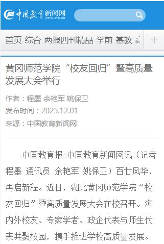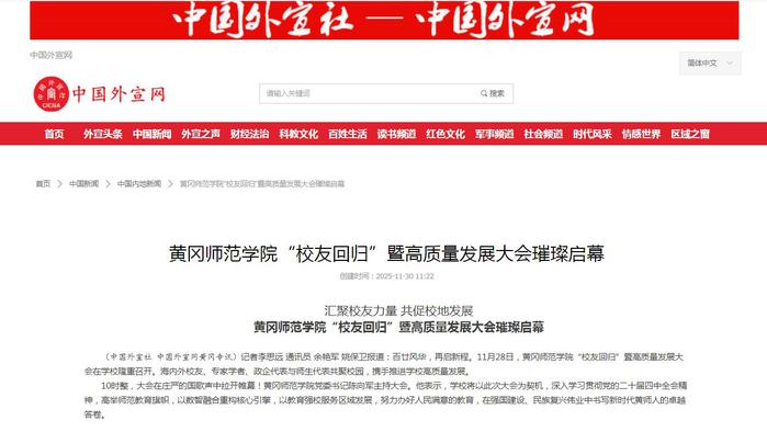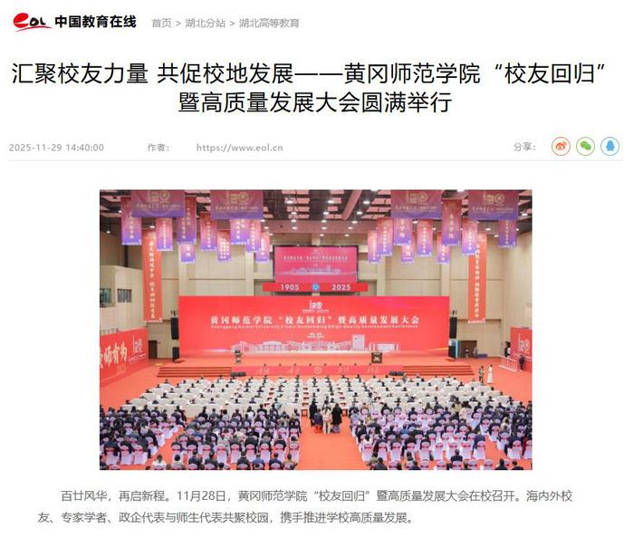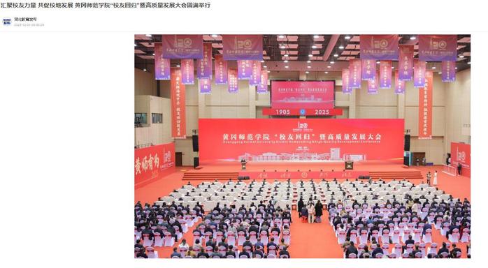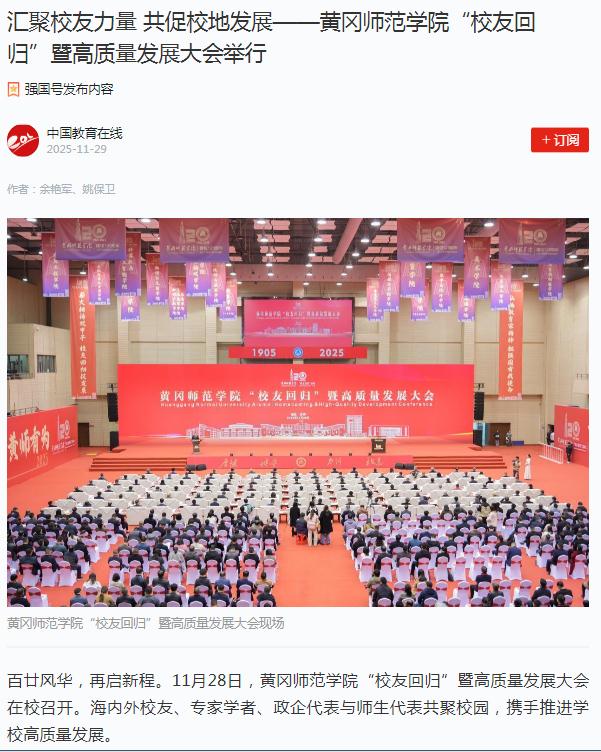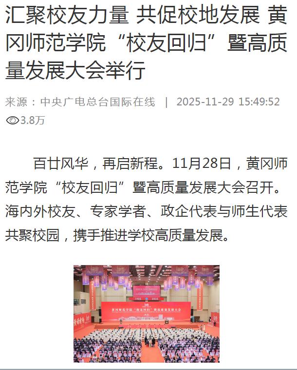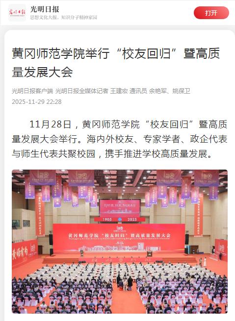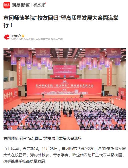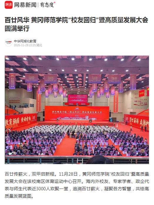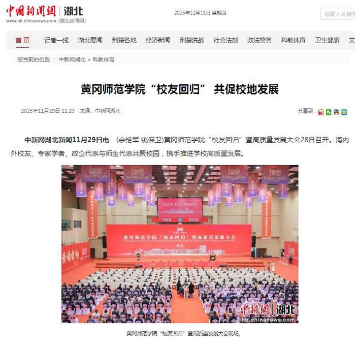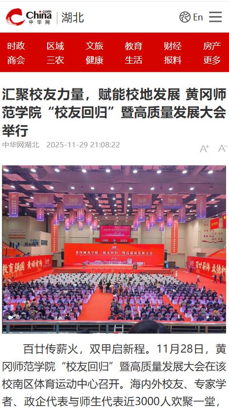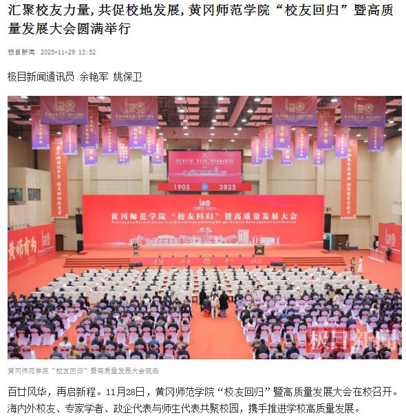 11月28日,黄冈师范学院“校友回归”暨高质量发展大会在校召开,海内外校友、专家学者、政企代表与师生代表共聚校园,携手推进学校高质量发展。大会受到媒体广泛关注,新华社、光明日报、中央广电总台国际在线、中国教育报、中华网、高校之窗、学习强国、中国教育在线、网易新闻、湖北日报、极目新闻、荆楚网、香港商报网、香港大公报、黄冈市人民政府网站等众多主流媒体、官方网站对大赛盛况进行了报道。