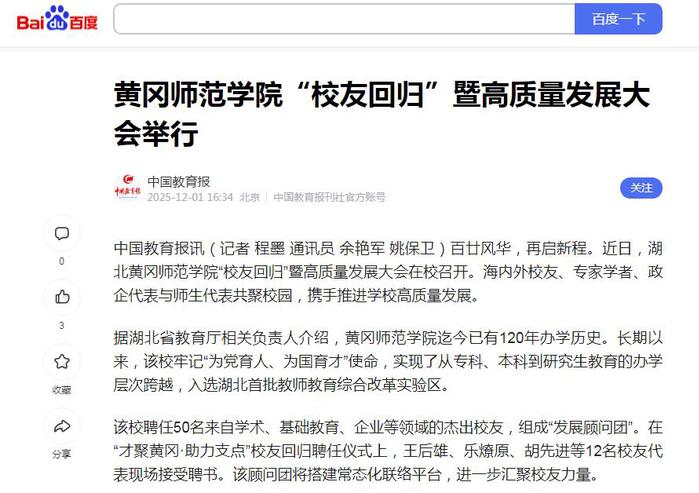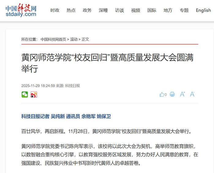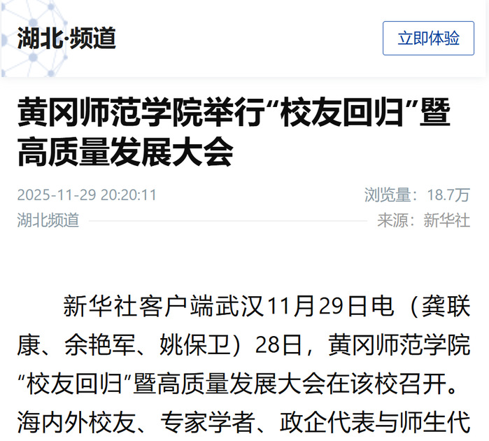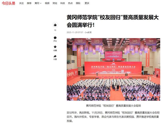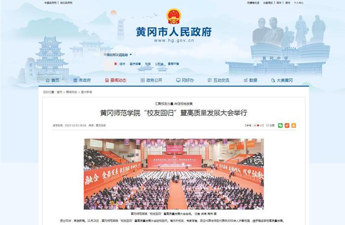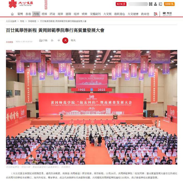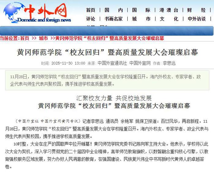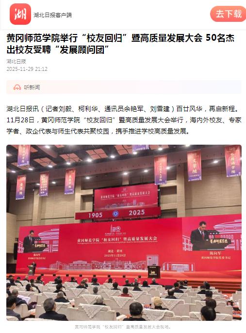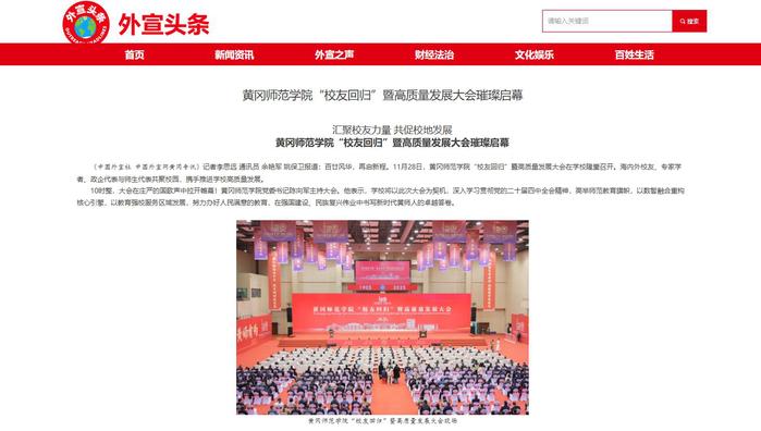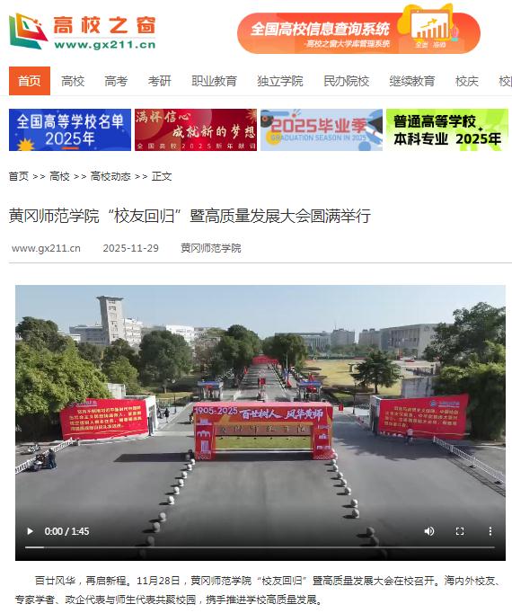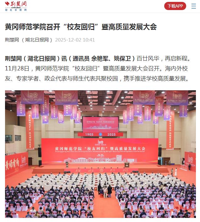 11月28日,黄冈师范学院“校友回归”暨高质量发展大会在校召开,海内外校友、专家学者、政企代表与师生代表共聚校园,携手推进学校高质量发展。大会受到媒体广泛关注,新华社、光明日报、中央广电总台国际在线、中国教育报、中华网、高校之窗、学习强国、中国教育在线、网易新闻、湖北日报、极目新闻、荆楚网、香港商报网、香港大公报、黄冈市人民政府网站等众多主流媒体、官方网站对大赛盛况进行了报道。