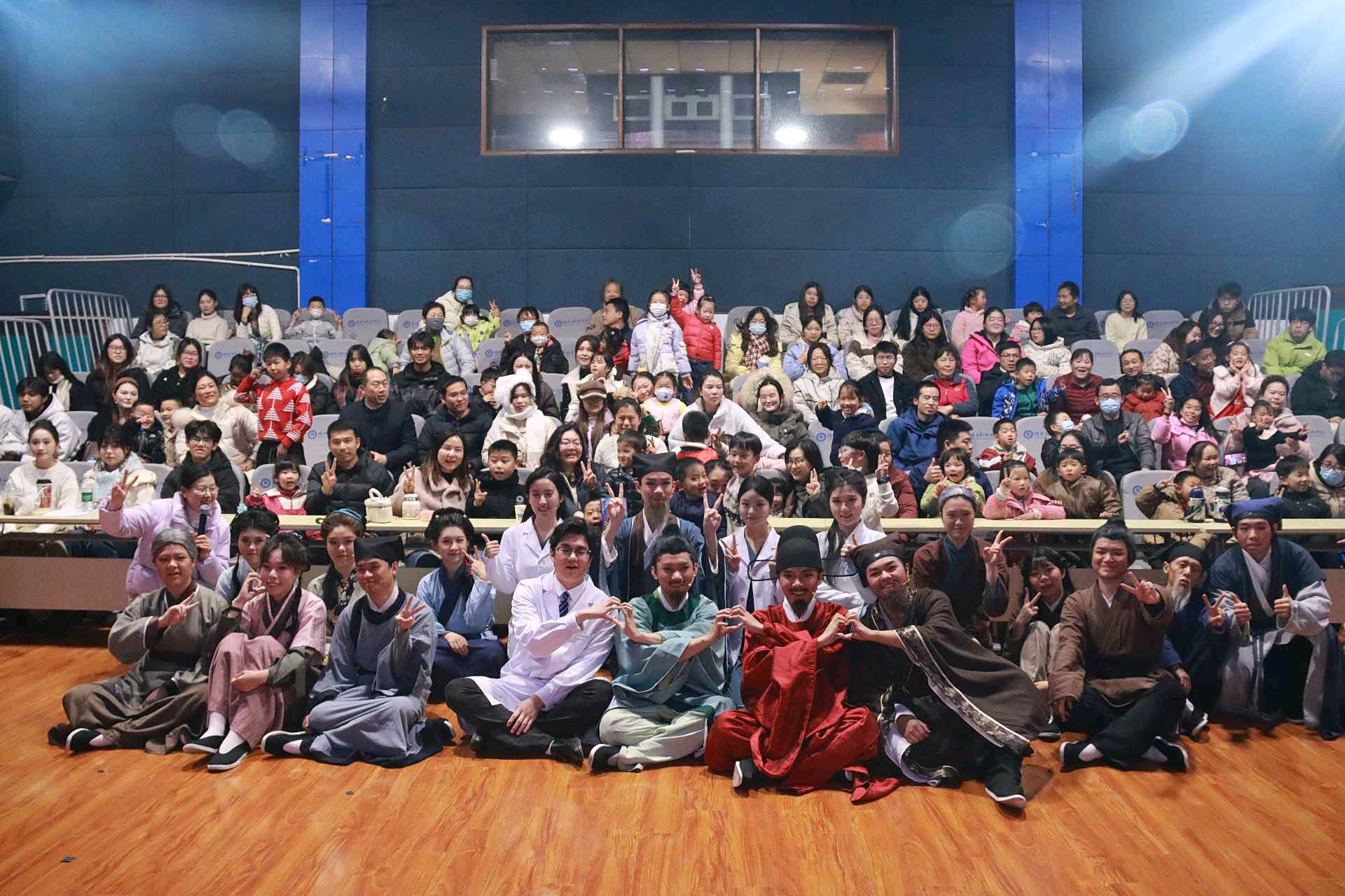 演出过程中,亲子间的温情互动贯穿始终。听到不解之处,家长轻声为孩子答疑解惑;看到动情瞬间,孩子紧紧握住父母的手传递共鸣;剧目间隙,一家人低声交流观演感想,分享心中触动。这种陪伴式观演让先贤的故事不再是遥远的历史记载,而是成为亲子间可探讨、可共鸣的鲜活话题。演出落幕,孩子们迫不及待地涌上舞台,与扮演先贤的哥哥姐姐们合影留念,小脸上洋溢着满满的欢喜与崇敬。“传媒学院的同学们太优秀了!故事演绎精准到位,台词功底扎实,情感表达真挚动人,内容更是精彩绝伦。”附属明珠幼儿园的沈老师全程沉浸其中,观演后难掩激动地连连称赞。