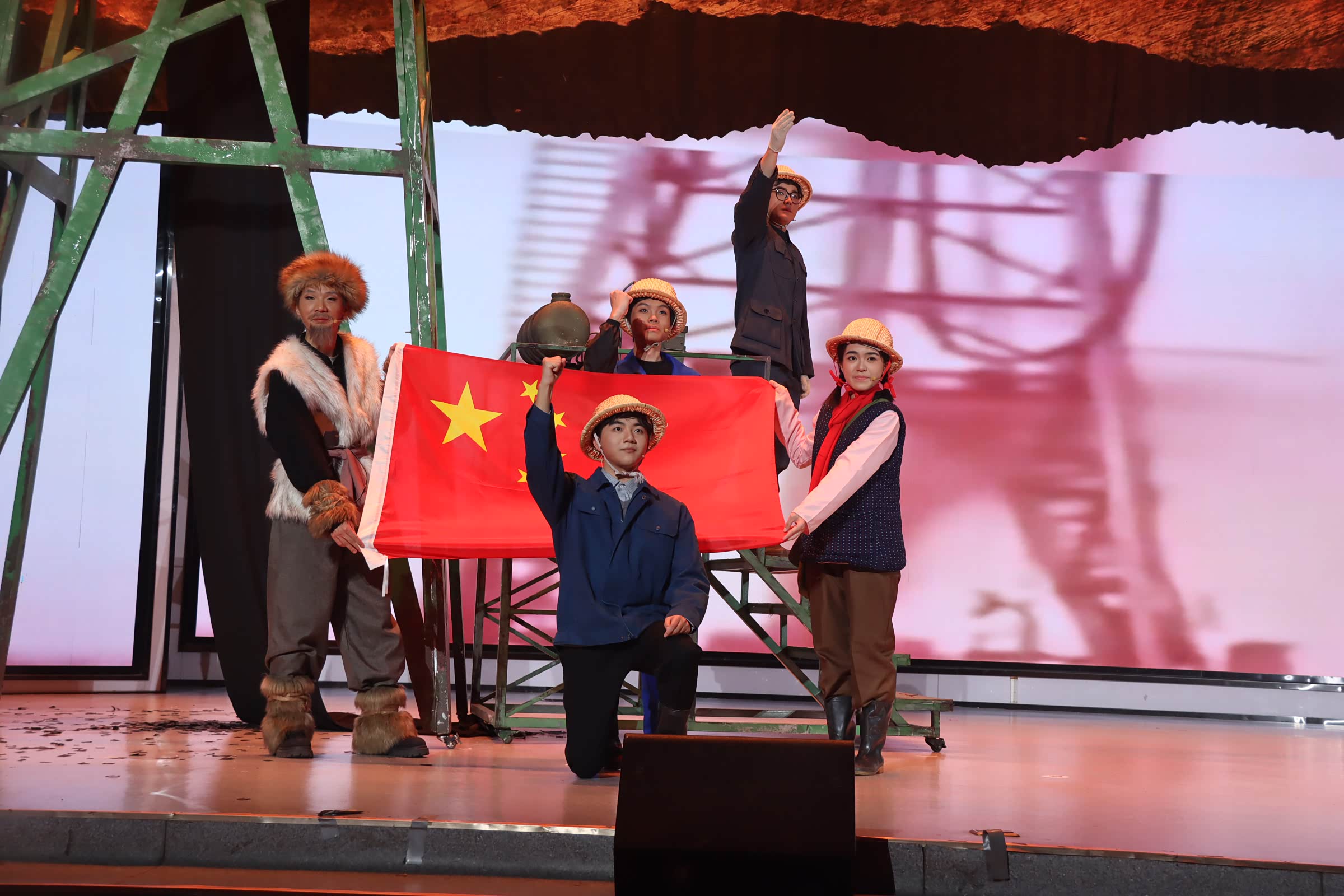 紧随其后,由黄冈师范学院大别山精神推普队担任演出团队的话剧《地脉寻踪》铿锵上演,将小观众带回到新中国成立初期百废待兴的峥嵘岁月。剧目围绕李四光先生的科研历程展开,讲述了他凭借深厚的科学素养与坚定的爱国信念,打破“中国贫油”的固有论断,顶住外部重重压力,克服恶劣的自然环境与匮乏的科研条件,最终为国家寻得宝贵油田的动人故事。舞台上,“李四光”与同事们面对设备简陋、资料短缺、外国专家质疑等诸多困境,始终坚守初心、不坠青云之志。当“油龙出世”的喜讯传遍舞台时,剧场内响起了孩子们自发的、热烈而持久的掌声。这一幕不仅展现了科学探索的艰辛与无穷魅力,更深刻诠释了知识分子科技报国、自力更生的赤子情怀,让“爱国”“奋斗”“创新”这些抽象的词汇,在孩子们心中变得具体可感、鲜活生动。