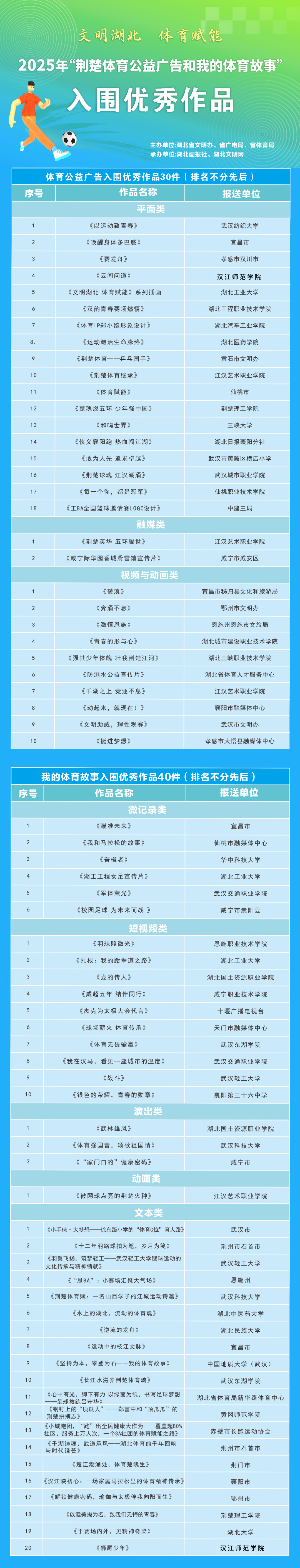 经过公平、公正、专业的全面考评,最终推选出入围优秀作品70件(体育公益广告30件,我的体育故事40件)。从即日起,入围优秀作品将通过湖北画报和湖北文明网线上平台陆续展播,有效传播科学健身理念。