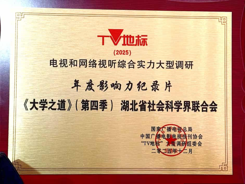 本网讯 近日,在北京举行的“TV地标(2025)”大型调研成果发布会上,国家广播电视总局中国广播影视报刊协会“TV地标”大型调研组委会,为湖北省社会科学界联合会牵头打造的国内首档大学生立德成长纪实节目《大学之道》第四季等9部作品颁发重量级奖项——“年度影响力纪录片奖”。