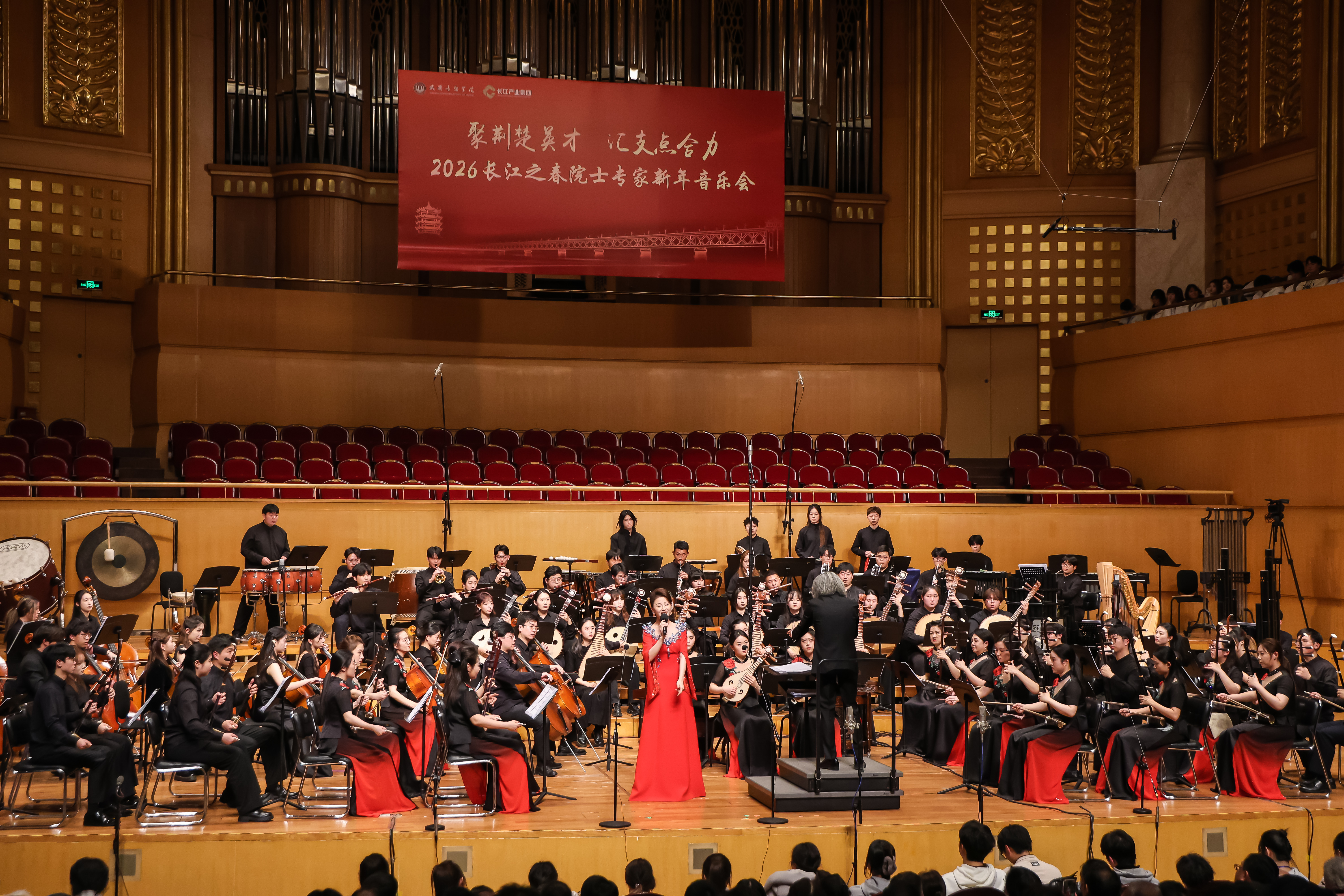 本网讯 12月29日,2026长江之春院士专家新年音乐会在武汉琴台音乐厅举行,省委常委、常务副省长张文兵,省委常委、省委组织部部长何良军,19位“两院”院士以及500多位国家级和省级专家人才代表参加。我校青年教师潘柠静以一曲黄梅戏经典选段《女驸马》向全省院士专家致以新年节日祝福。