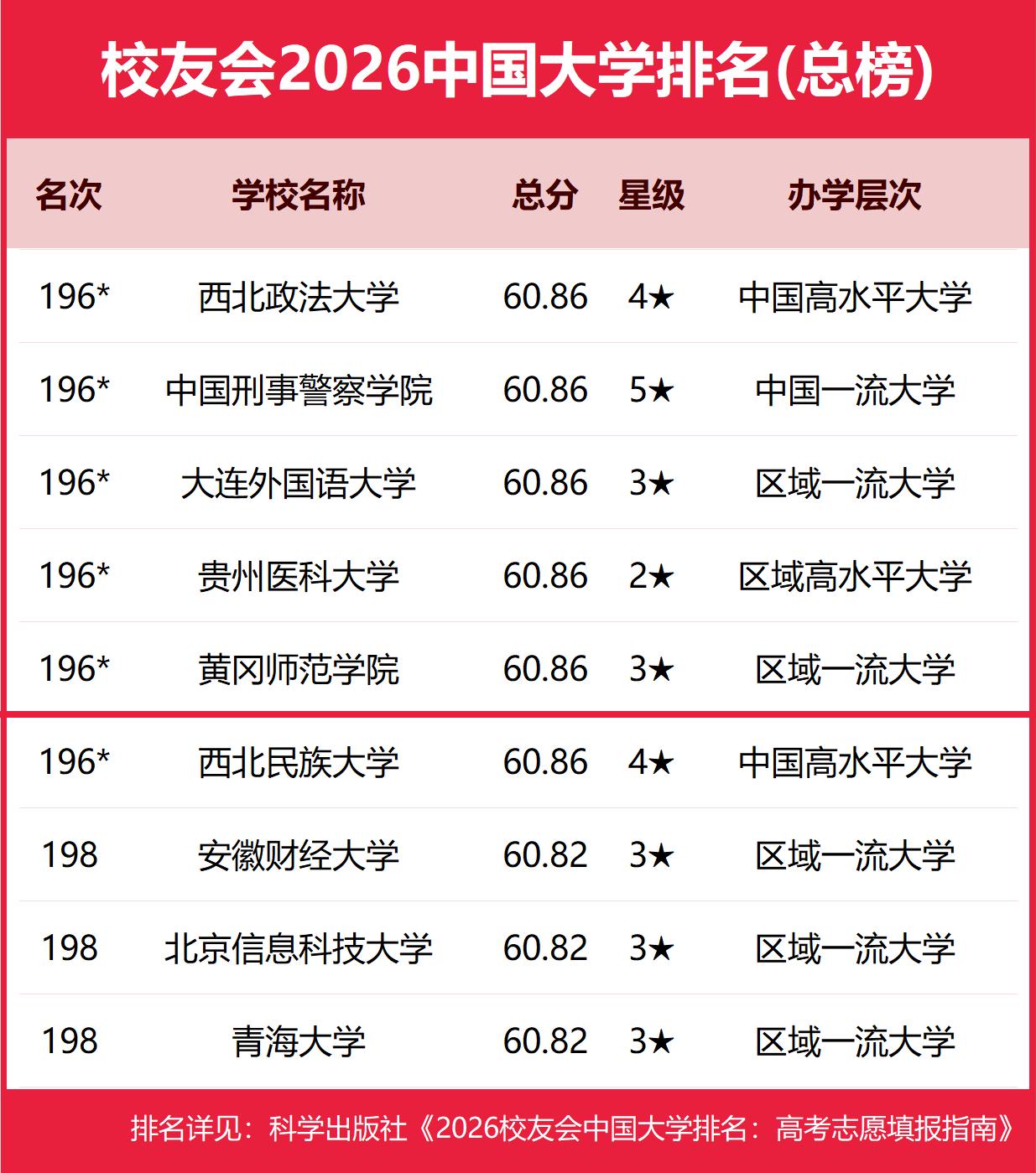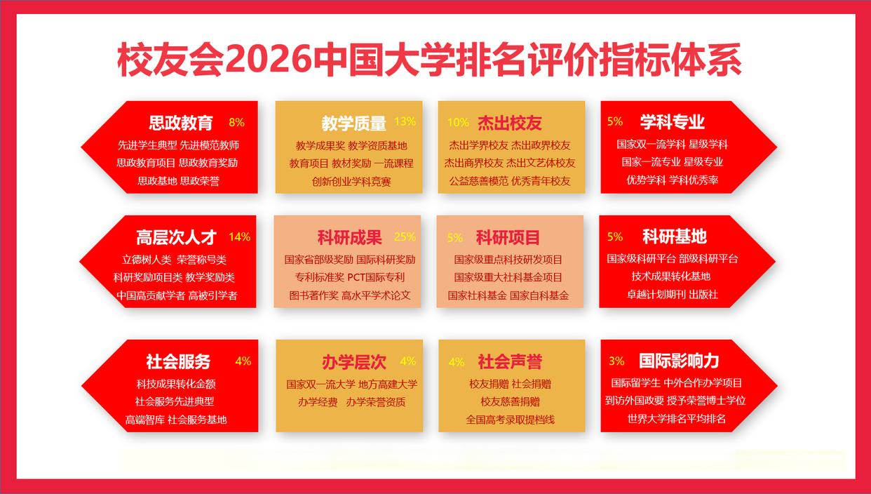 据悉,校友会中国大学排名首发于2003年,至今已有24年的历史。校友会2026中国大学排名评价指标体系由办学层次、思政教育、教学质量、高层次人才、杰出校友、学科专业、科研基地、科研项目、科研成果、社会服务、社会声誉和国际影响力等12大一级指标组成,基于“大平台、大团队、大项目、大成果、大校友”体系框架展开系统评价,涵盖的评价指标达900多项。校友会中国大学排名是目前国内评价体系最为系统全面、客观独立,评价体系和评价方法最为稳定,评价指标和参评高校数量最多,最符合国家政策与价值导向的中国大学排名。