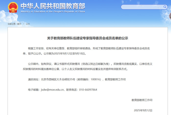 2025年9月12日,教育部发布《关于教育部教师队伍建设专家指导委员会成员名单的公示》。根据工作安排,经有关单位推荐,教育部组织审核遴选,形成了教育部教师队伍建设专家指导委员会成员名单。我校党委常委、副校长宋文生教授位列其中,任中学教师培养分委会委员。