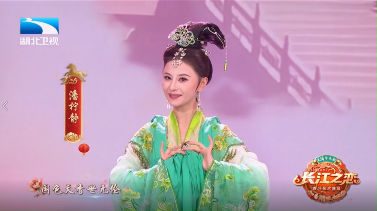 在央视戏曲频道的《鹳雀楼上·梨园情深》节目中,潘柠静老师倾情演绎黄梅戏《小调联唱》。她以清丽婉转的唱腔、灵动自然的表演,将黄梅小调的清新雅致与节日喜庆氛围融为一体,充分展现传统戏曲的隽永魅力。在湖北卫视春晚舞台上,潘柠静老师参演经典剧目《天女散花》,凭借柔美身段与细腻表演,将这一国家级非物质文化遗产的典雅气韵呈现得淋漓尽致,也为荆楚文化的传承与传播增添亮色。