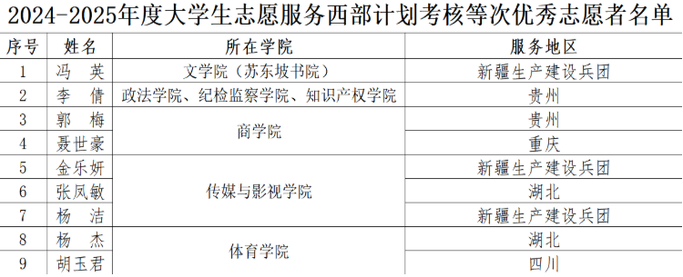 此次获奖的志愿者来自文学院(苏东坡书院)、政法学院等5个学院,服务区域包括新疆生产建设兵团、贵州、湖北、四川、重庆、新疆维吾尔自治区等6个省(自治区、直辖市、兵团),充分体现了该校学子响应国家号召、奔赴西部基层的责任担当。
