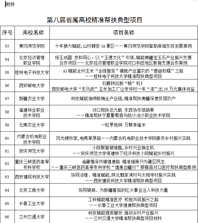 本网讯 近日,教育部公布第八届省属高校精准帮扶典型项目评选结果,全国共推选产生典型项目66个。我校申报的《十年接力赋能,山村蝶变3A景区》成功入选,成为全省两所入选高校之一,充分彰显了学校在服务乡村振兴战略中的积极作为与显著成效。