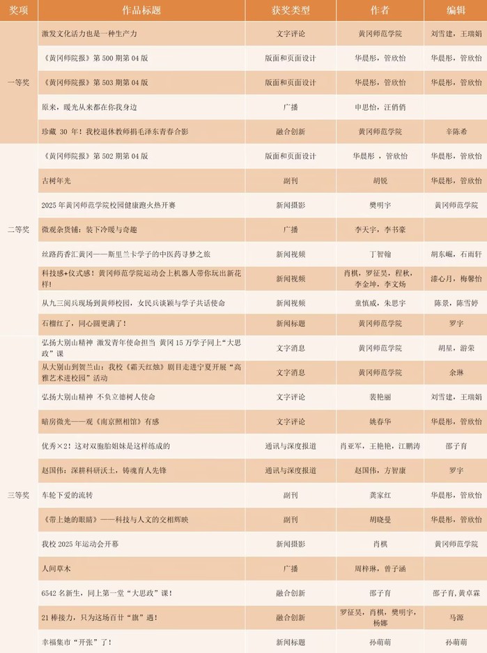 在获奖的26件作品中,《激发文化活力也是一种生产力》获文字评论类一等奖,《黄冈师院报》第500期第04版、《黄冈师院报》第503期第04版获版面和页面设计类一等奖,《原来,暖光从来都在你我身边》获广播类一等奖,《珍藏30年!我校退休教师捐毛泽东青春合影》获融合创新类一等奖;《黄冈师院报》第502期第04版获版面和页面设计类二等奖,《古树年光》获副刊类二等奖,《2025年黄冈师范学院校园健康跑火热开赛》获新闻摄影类二等奖,《微观杂货铺:装下冷暖与奇趣》获广播类二等奖,《丝路药香汇黄冈——斯里兰卡学子的中医药寻梦之旅》《科技感+仪式感!黄冈师范学院运动会上机器人带你玩出新花样!》《从九三阅兵现场到黄师校园,女民兵谈颖与学子共话使命》获新闻视频类二等奖,《石榴红了,同心圆更满了!》获新闻标题类二等奖;《弘扬大别山精神 激发青年使命担当 黄冈15万学子同上“大思政课”》《从大别山到贺兰山:我校〈霜天红烛〉剧目走进宁夏开展“高雅艺术进校园”活动》获文字消息类三等奖,《弘扬大别山精神 不负立德树人使命》《暗房微光——观〈南京照相馆〉有感》获文字评论类三等奖,《优秀×2!这对双胞胎姐妹是这样练成的》《赵国伟:深耕科研沃土,铸魂育人先锋》获通讯与深度报道类三等奖,《车轮下爱的流转》《〈带上她的眼睛〉——科技与人文的交相辉映》获副刊类三等奖,《我校2025年运动会开幕》获新闻摄影类三等奖,《人间草木》获广播类三等奖,《6542名新生,同上第一堂“大思政”课!》《21棒接力,只为这场百廿“旗”遇!》获融合创新类三等奖,《幸福集市“开张”了!》获新闻标题类三等奖。
