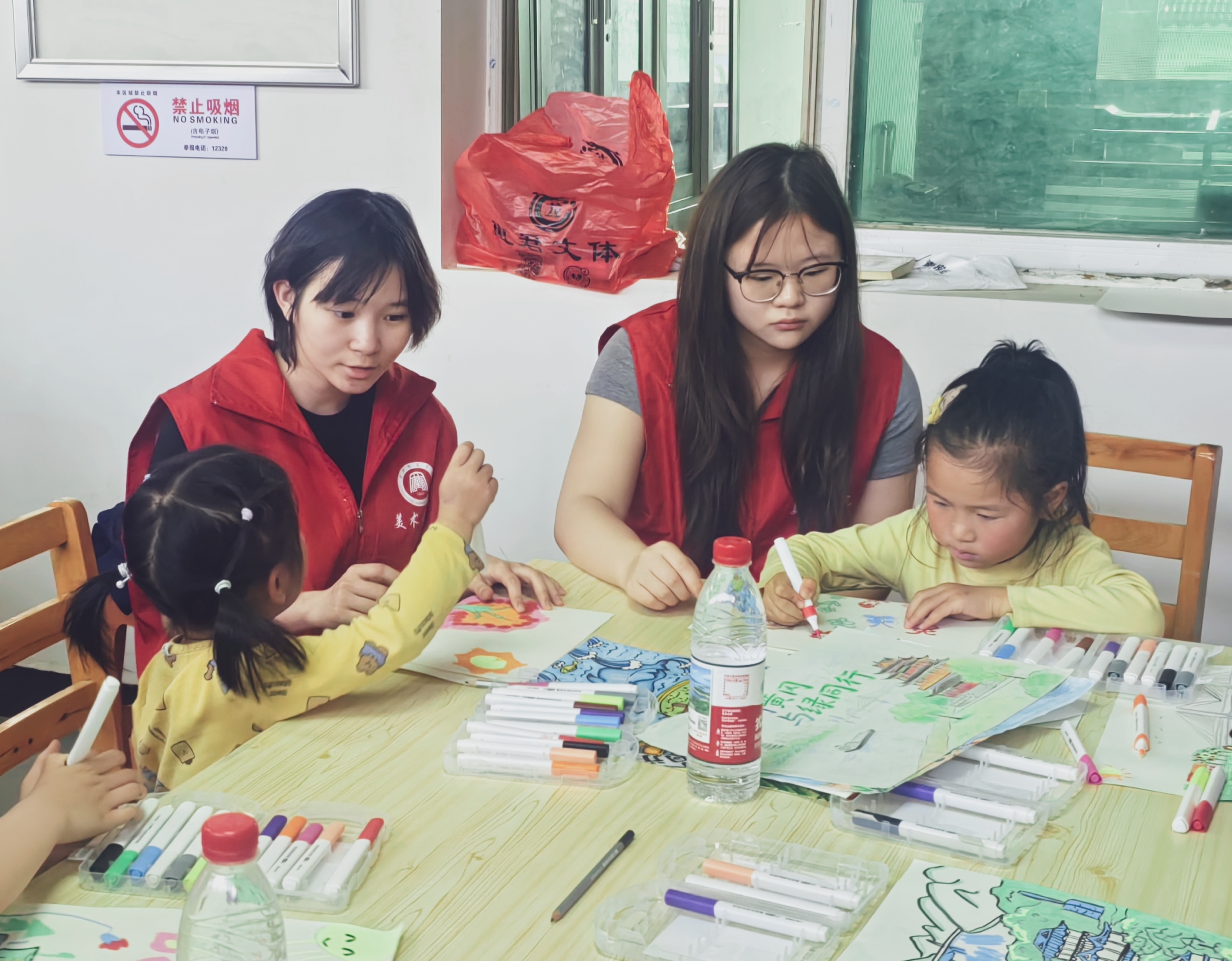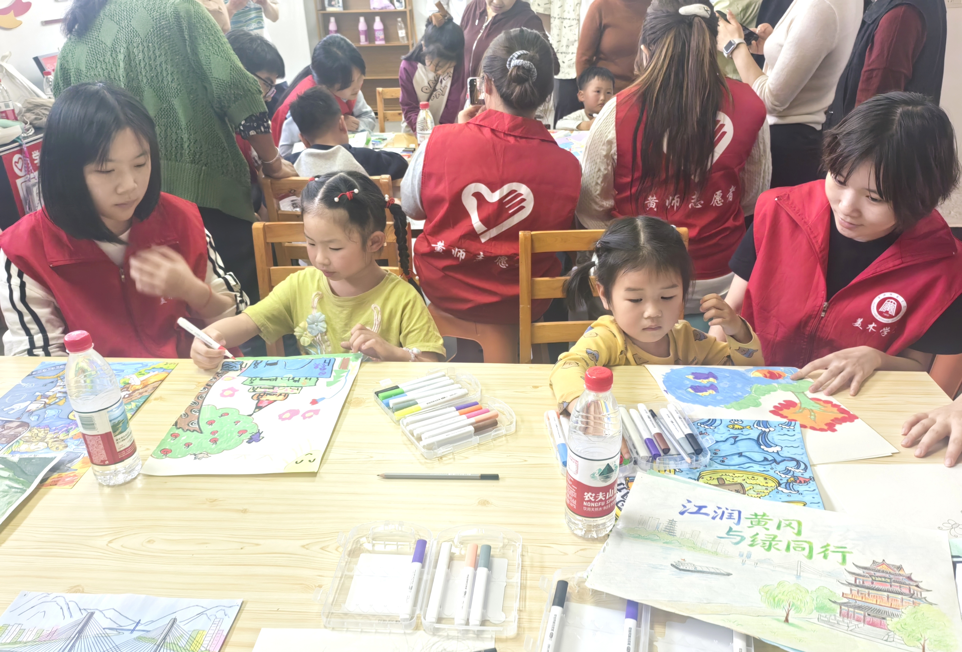下午3时,黄冈师范学院美术学院10余名志愿者围绕环保保护主题,结合长江、遗爱湖、白潭湖等黄冈地域元素,为孩子们生动讲述了环保的重要意义。志愿者们将色彩、构图等美学知识融入讲解,引导孩子们拿起画笔,用艺术的语言表达对绿色家园的热爱与守护。