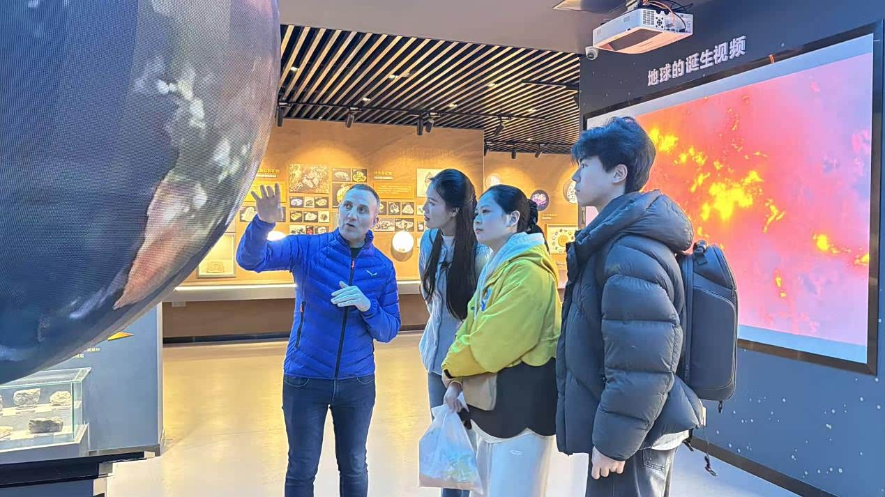 下午,一行人来到张家畈地质科普馆。该馆是全国唯一的村级科普教育基地。桑切斯教授本科主修地理学,面对馆内大别山典型地质构造与岩石标本时格外投入。他向推普队队员讲解道:“大别山不是‘长’出来的,是两块大陆挤出来的。地球是一个巨大的拼图,这就是两块拼图碰撞的地方。”他表示,将地质文化、科学普及与语言传播相结合,是地理教育、可持续教育与媒介实践深度融合的生动体现。