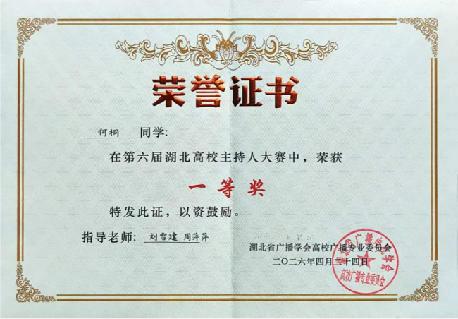 4月24日,第六届湖北高校主持人大赛在湖北经济学院举行。由黄冈师范学院党委宣传部选送的黄师之声广播台台员何桐,凭借过硬的专业能力与出色的临场表现,荣获大赛一等奖。这是该校连续多届在该赛事中斩获一等奖,续写了学校在主持人类赛事中的优异成绩。